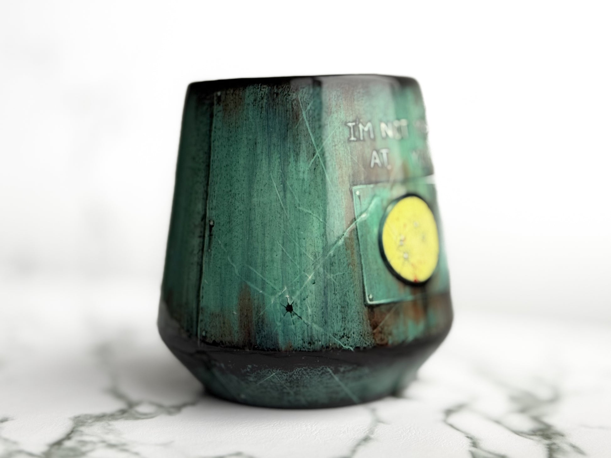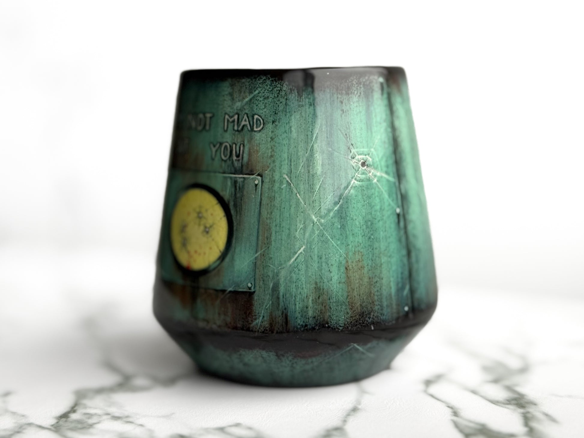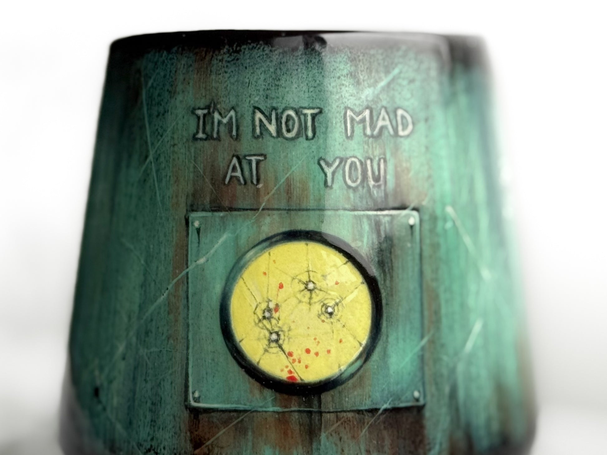 Weathered spacecraft featuring the last words of Renee Good, "I'm Not Mad at You." Hand-painted on a 16oz angled cup.